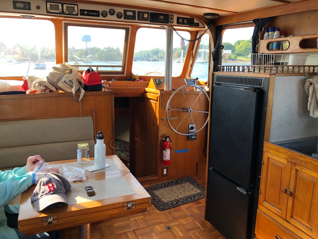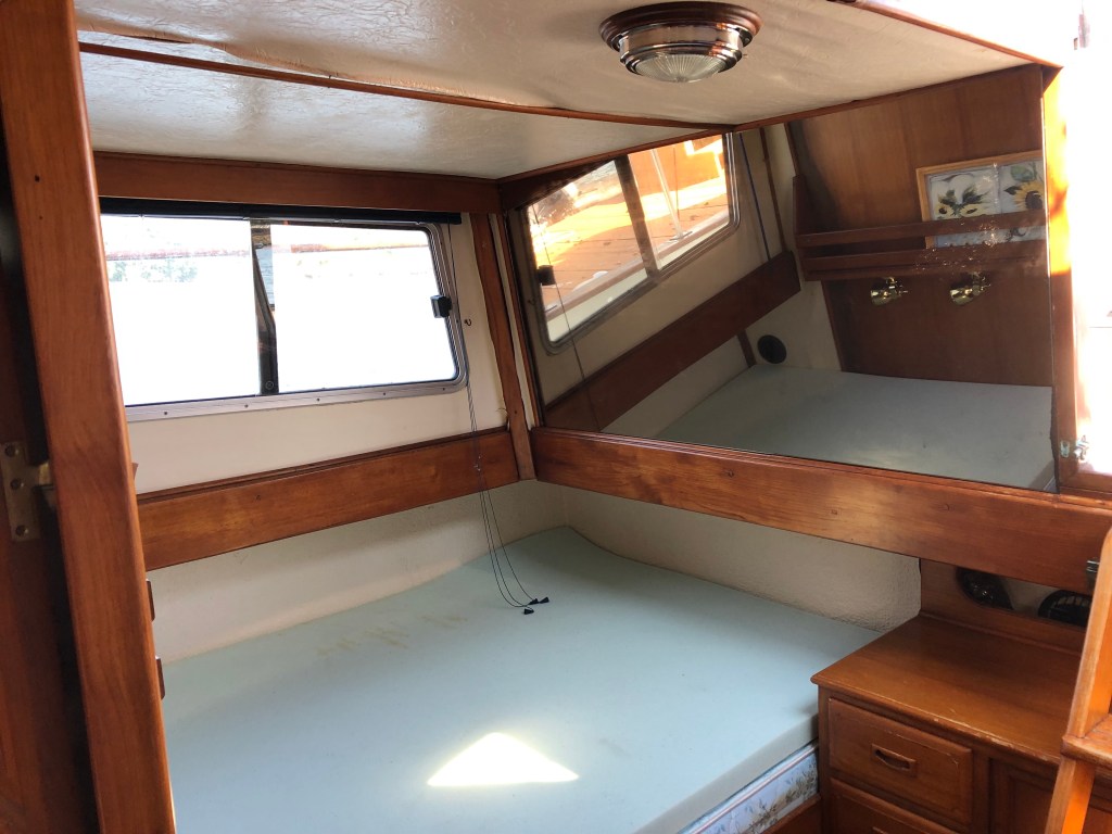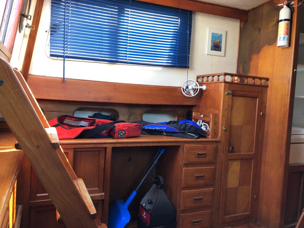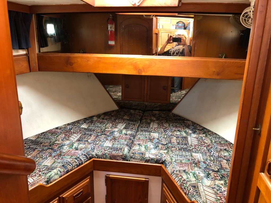 Dumbledore is a 1979 36-foot Marine Trader. He has a comfortable, rectangular salon/galley with an indoor forward helm station next to a sliding door to the starboard gunwhale, an L-shaped seating area with under-seat storage around a table with two drop leaves, a fridge/freezer, and a four-burner propane stove with oven. There is decent counter space for food prep and a coffee pot, and lots of cabinet storage for a boat this size. The prior owners installed a second freezer in a storage locker in the aft companionway. This was an important addition because the other tiny one doesn’t keep ice cream frozen. Mmmm…ice cream. They also installed three shelves above the freezer. Hello pantry!