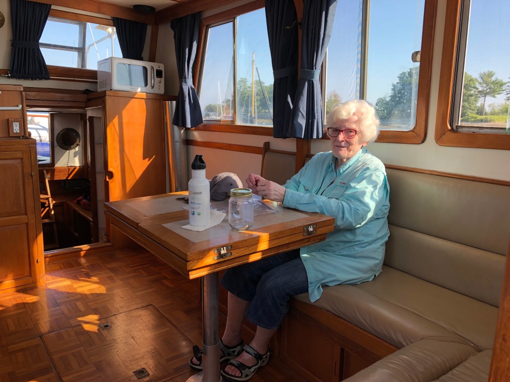 Thursday was bright, sunny, and windy. The seas were going to be up, so we decided to cruise up the Cocheco River to Dover. We invited my folks to come along. Dad couldn’t make it, but Mom joined us. We rode the tide up the Piscataqua River to the Cocheco. We had our engines set for 7 knots, but at one point the tide & current had us going almost 12 knots- wahoo! It was VERY windy, the hold-on-to-your-hat kind of windy! There is a marina near the part of the Cocheco River that enters the town of Dover that used to have a dock for day visitors. It’s still there, but it’s smaller than it used to be and there were already two day boats tied up. So we turned around and dropped the anchor out of the channel about 0.5 mile down river and ate lunch aboard before returning to our mooring. We got to ride the outgoing tide, although it wasn’t as fast-flowing as the trip up. It was also less windy on the return trip. When we got to our mooring, we returned Mom to the boat launch where Dad picked her up, and Dave & I returned to Dumbledore for our final night aboard.