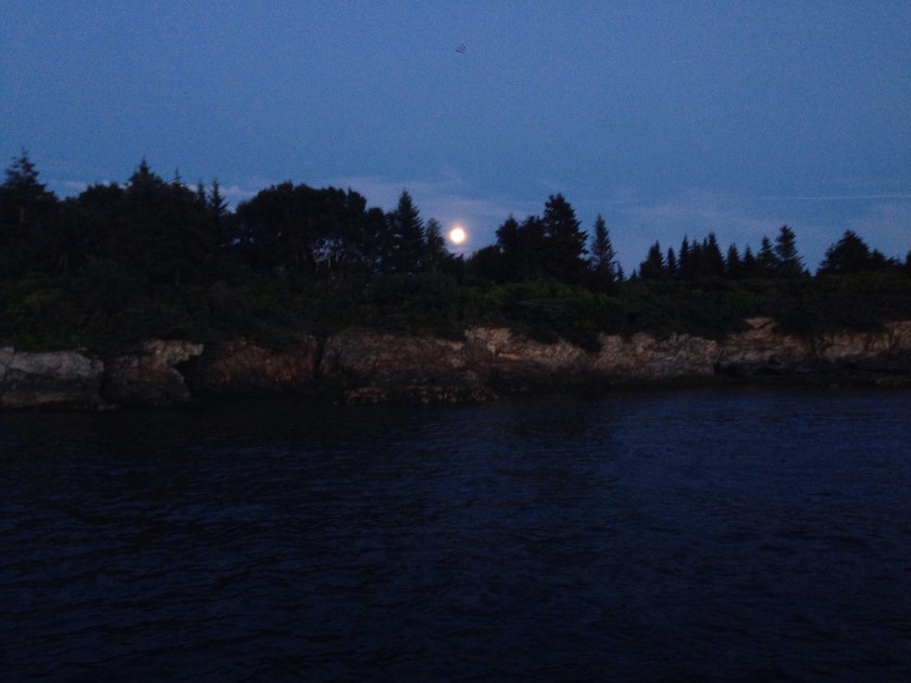 Thursday morning we filled our water tanks and dropped off our Garbage at Brewer’s Marina before leaving South Freeport in a little fog, and had a good trip over to Jewell Island, beating the predicted rain. There were 5 other boats there already, so we anchored at the back of the line, still sheltered in the little cove, with only a little wrap-around swell from the point to the west. To the east it was blue sky with a few clouds. To our west, coming from the mainland (off Portland), there was fog and rain heading toward us. It finally reached us in the afternoon, but then it cleared again, stuff dried out, and we were able to eat out in the cockpit. We watched the sun set and the full moon rise, and Dave pointed out Venus, Jupiter and Mars on the ecliptic with the moon.
